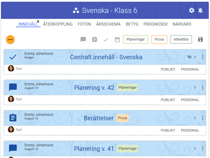 Under återkoppling så finner man samma utbildningsflöde som under innehåll fast uppdelat individuellt per elev/student. Det betyder att inlägg här är privata mellan undervisare och den eleven/studenten. Här finns också
