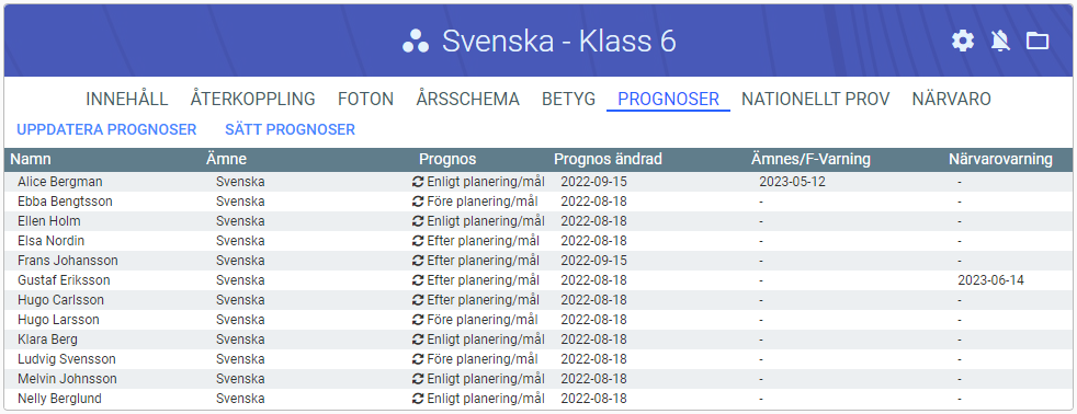 Här finns en samlingssida över prognoserna för alla elever på ytan,