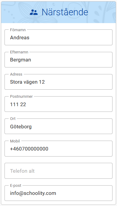 - Skolan bestämmer huruvida närstående själva får ändra på sina kontaktuppgifter. Om fälten ej är editerbara måste närstående kontakta skolan för att få hjälp med att ändra sina uppgifter