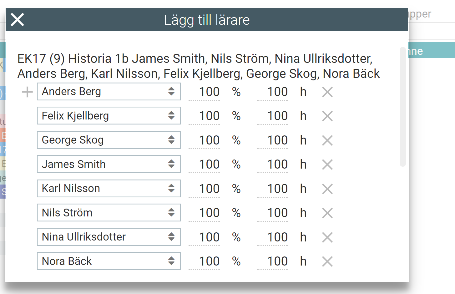 Här kan man lägga till / ta bort eller ändra lärarens timmar på lektionen.