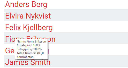 Håll muspekaren över namnet på en personal för att visa informationen om en specifik lärares tjänstegrad direkt i listan över tjänstefördelningen. Då visas information om lärarens arbetsgrad, beläggning och timmar.