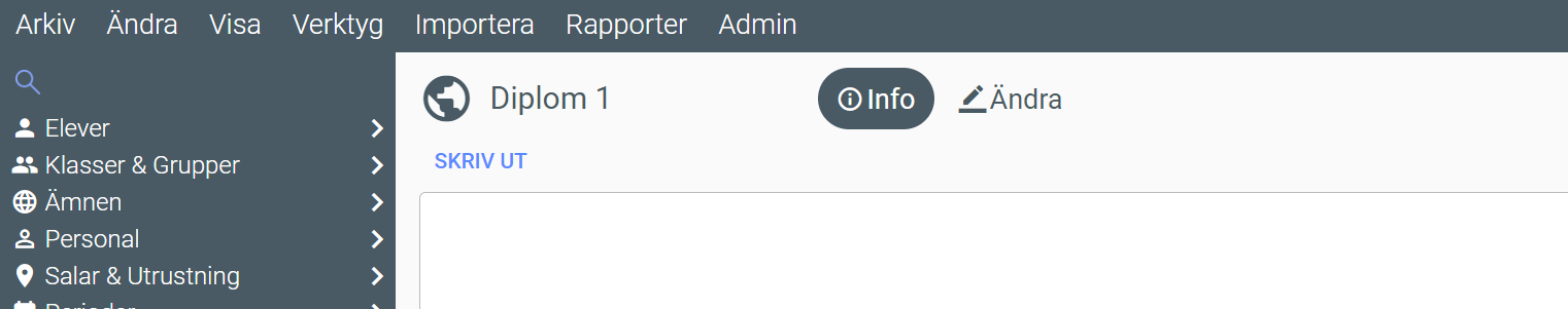 - Gå till studieplanen för en elev och där trycka på skriv ut knappen, här kan man sedan välja diplomet som ska skrivas ut. Diplomet kommer bara skrivas ut för den aktuella eleven.