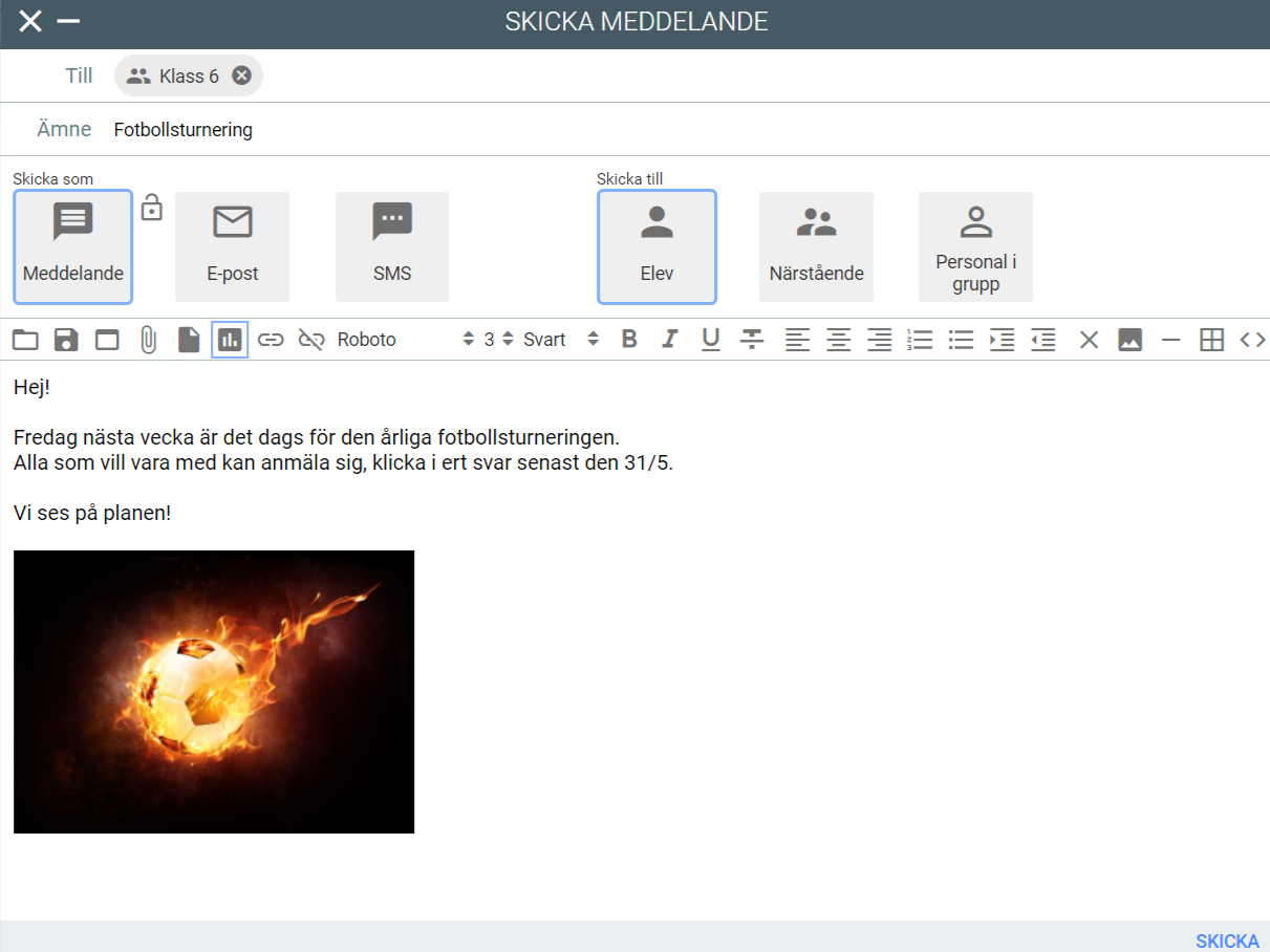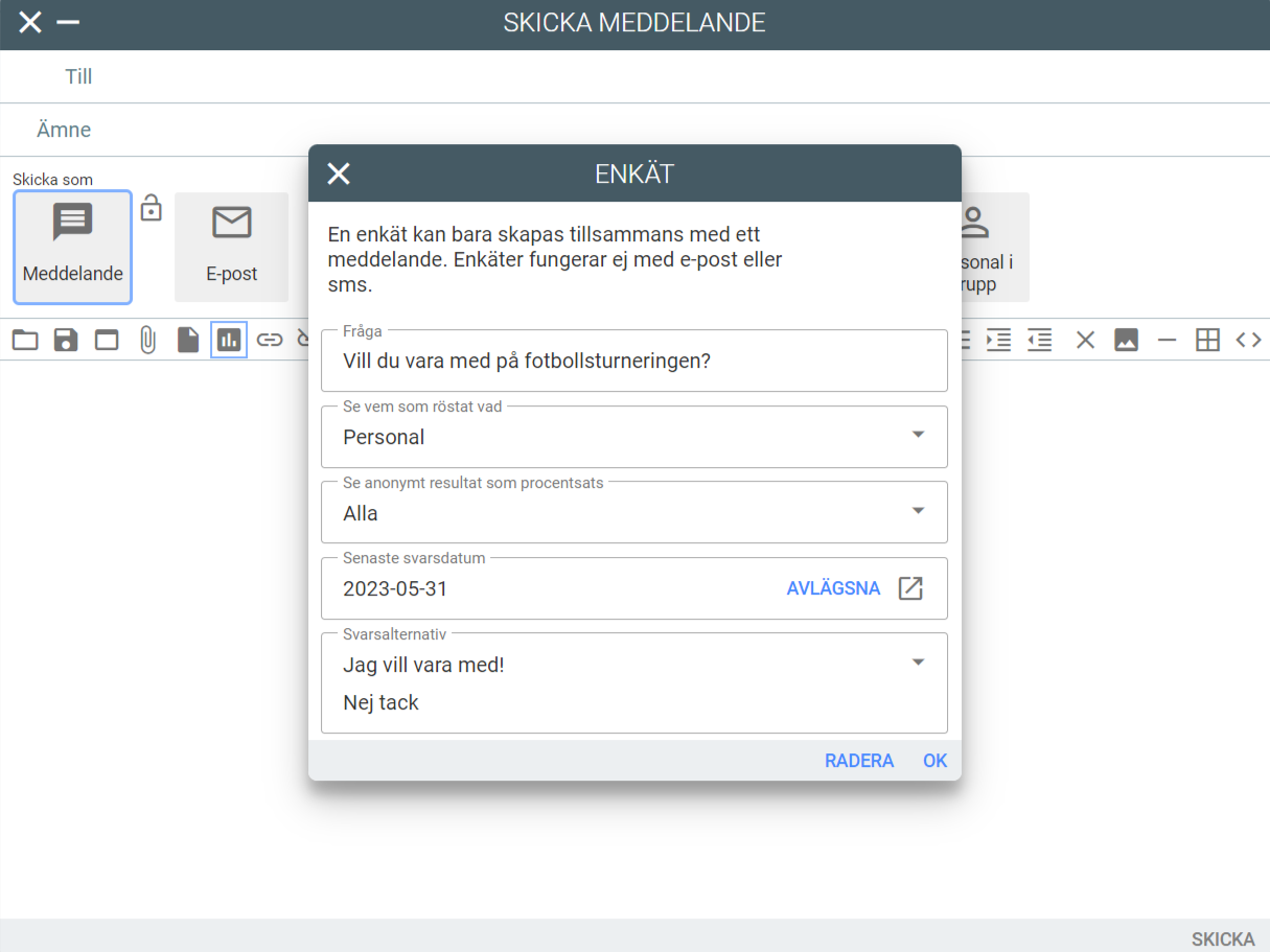När du skickar ett meddelande kan du skapa Enkäter för till exempel omröstningar eller anmälningsformulär.