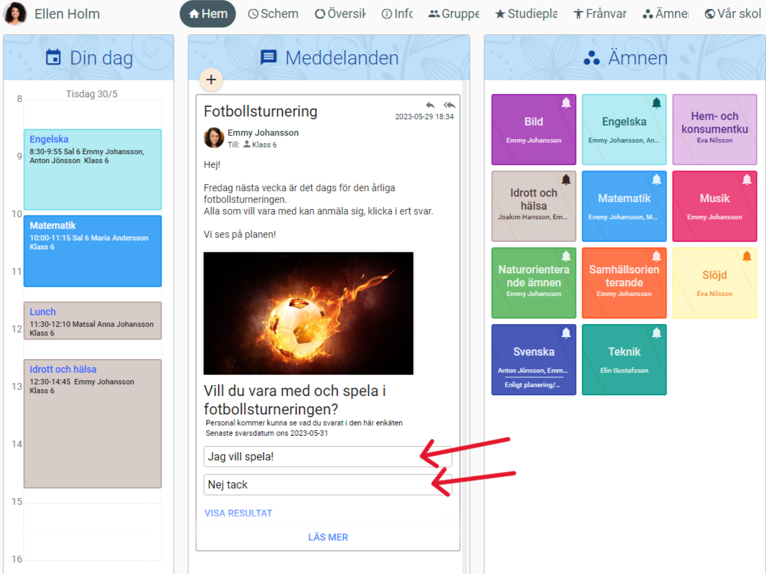 Den som har behörighet att se meddelandet kan svara på enkäten. Att svara görs enkelt genom att klicka på något av svarsalternativen.