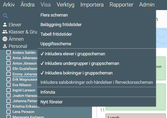 Det finns flera olika översiktssidor för fritids. Markera de elever eller den/de grupper som du vill visa och klicka sedan på Visa i menyraden, där finns Beläggning fritidstider och Tabell fritidstider.