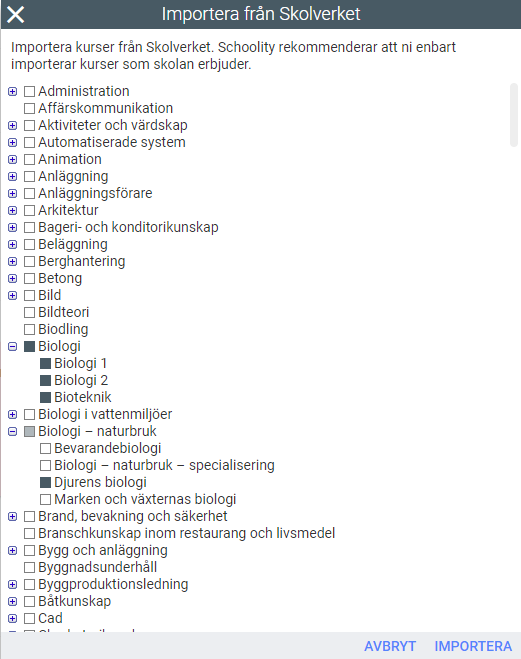 Ett träd visas där du kan markera de kurser du vill importera. Observera att vissa kurser, t.ex. ovanligare typer av språkval, inte går att importera här. De kurserna lägger du enkelt till manuellt.