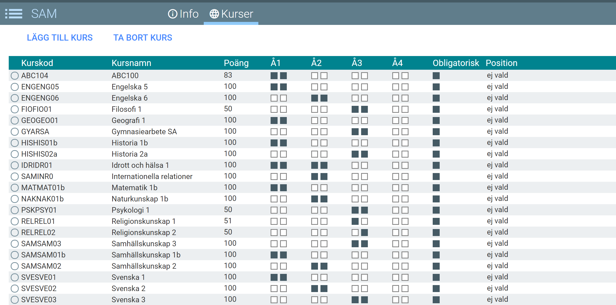 Under fliken "Ämnen" ställer man in vilka terminer som eleverna ska läsa respektive ämne och skilja på obligatoriska (hamnar automatisk på elevens individuella studieplanen) och icke-obligatoriska ämnnen.