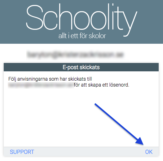 Skriv in den e-postadress som är registrerad hos skolan och klicka NYTT LÖSENORD igen.