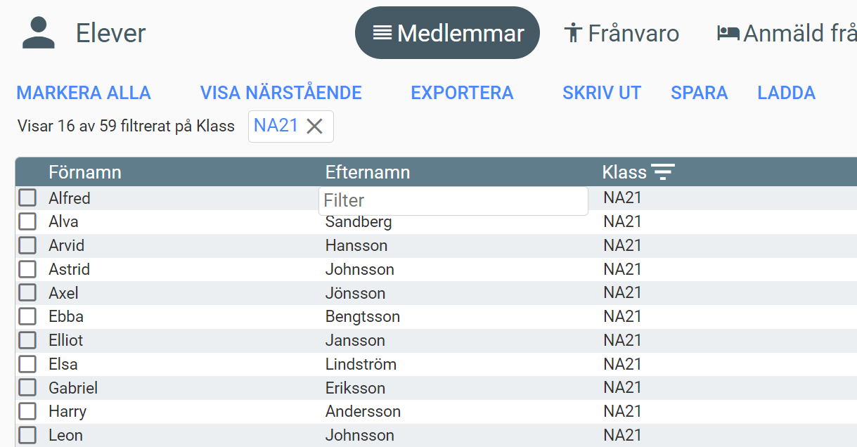 Dessa kan användas för att spara och ladda aktuell filtrering+sortering. Den här funktionen är enbart tillgänglig för personal på skolan och är till för att ha lättare åtkomst till filtreringar som skolan finner att de gör ofta.