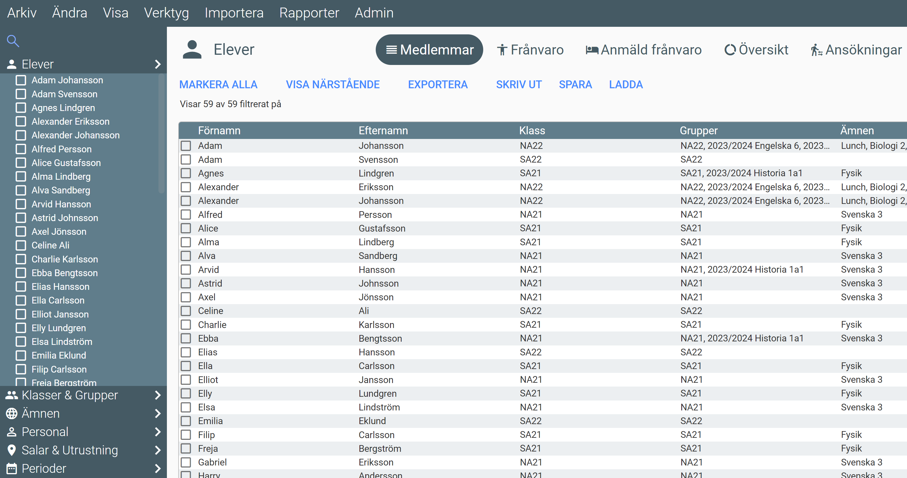 I tabellerna över elever/studenter, personal samt ansökningar så tillkommer alternativen "Spara" och "Ladda" i knappraden.