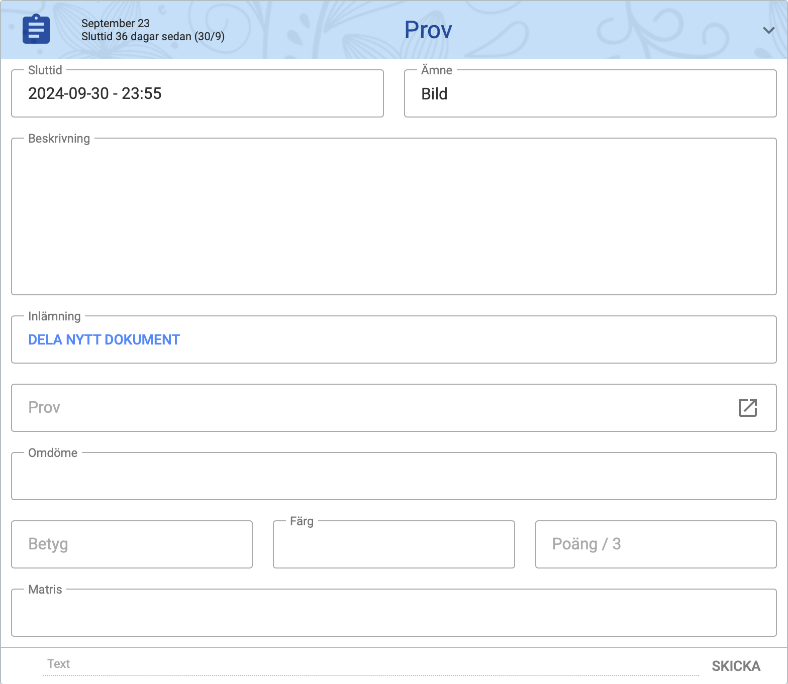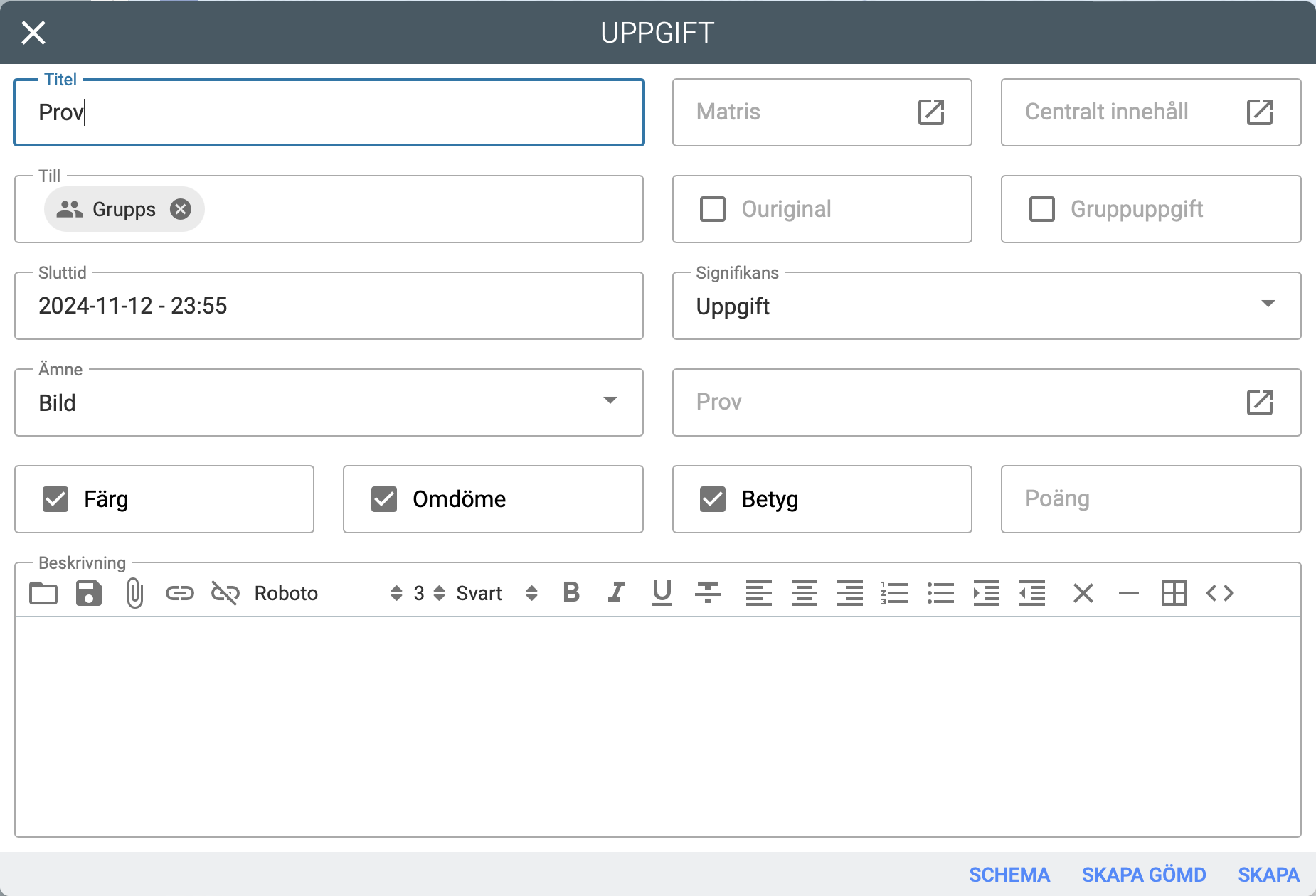 - Beskrivning - Text som beskriver provet. Elever kommer kunna se den här texten innan provet startas.