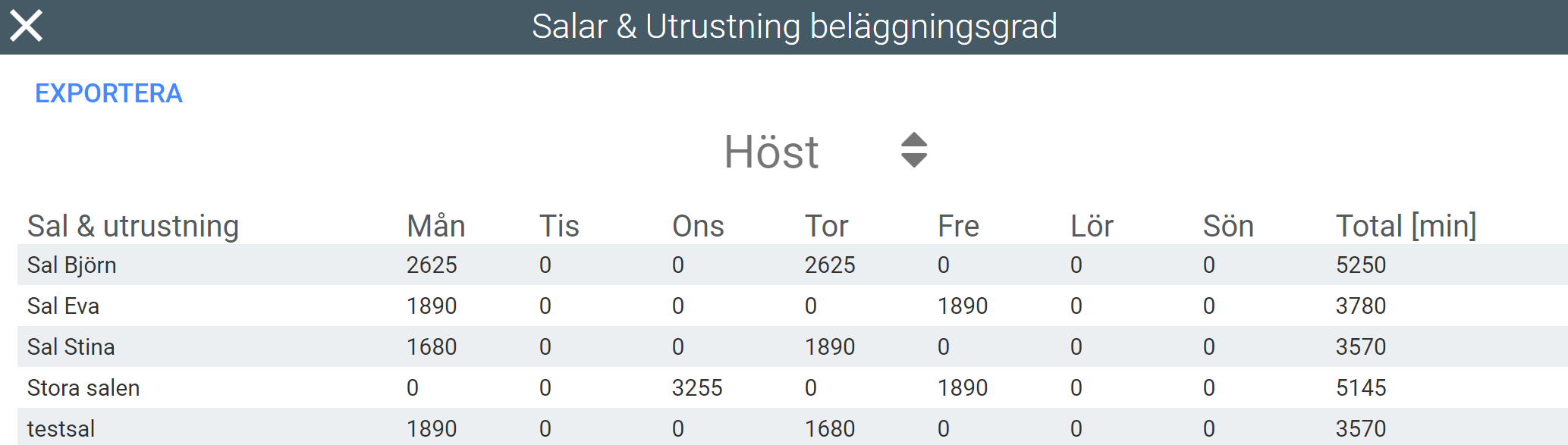 En rapport finns för att få en översikt över beläggningsgraden för skolans salar & utrustning.