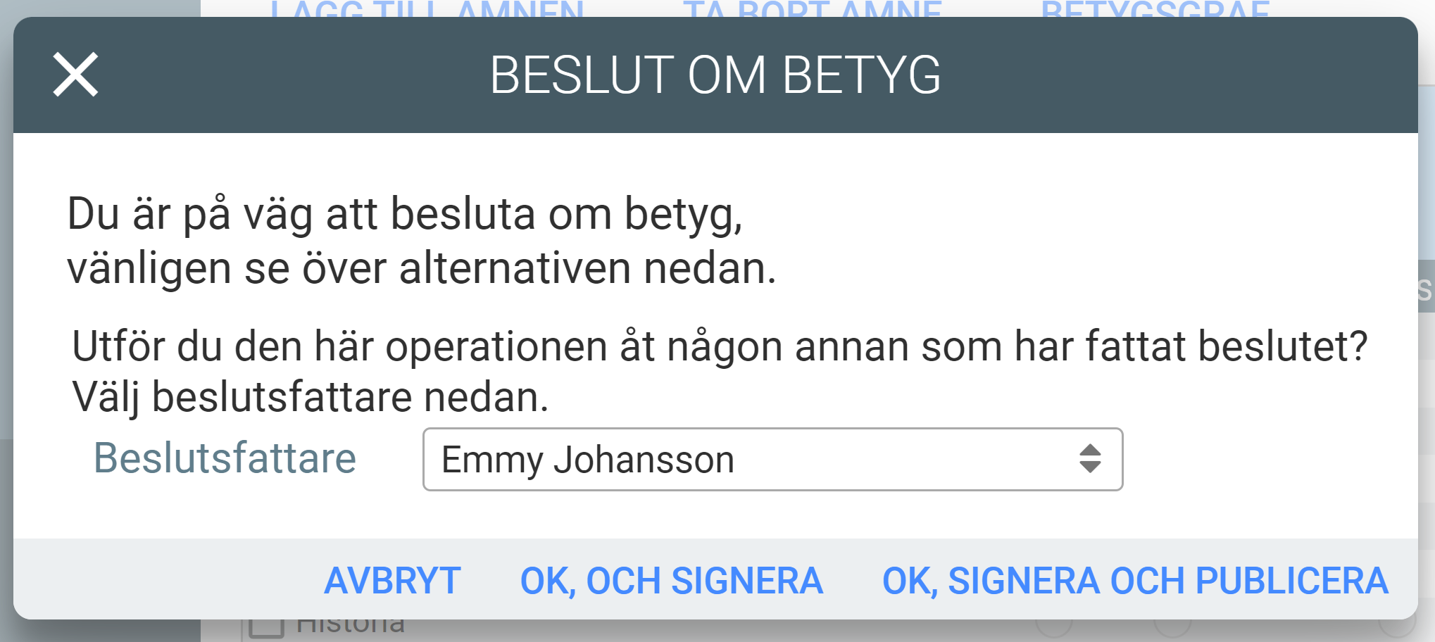 - Välj vem som ska stå som beslutsfattare för betyget. Slutför genom att välja "Ok, och signera" eller "Ok, signera och publicera". Läs mer om att Signera betyg här, och om att Publicera betyg här.