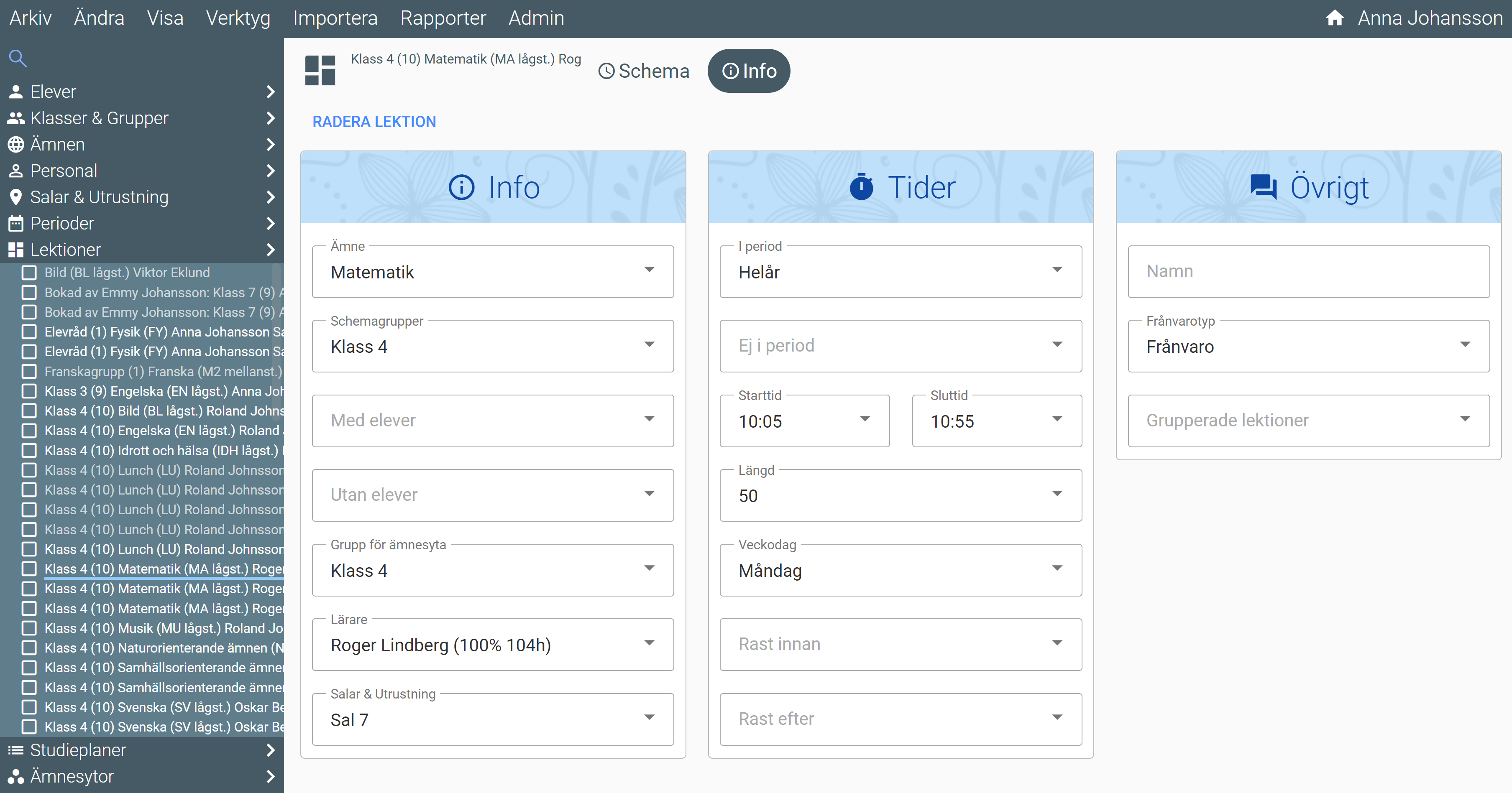 Lektionens längd baseras på antalet "Schemalagda timmar" som står på ämnets Info-sida, fördelat över antalet tillfällen under den Period som är kopplad till lektionen.