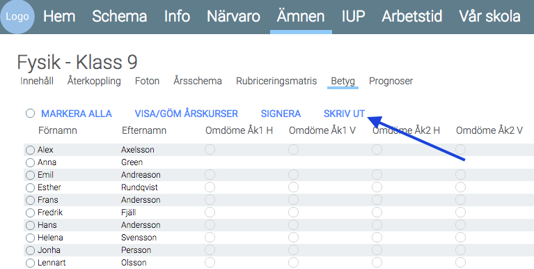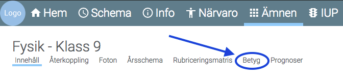 Klicka på “Betyg” bland knapparna under ämnets namn.