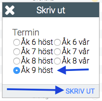 En ny ruta kommer upp där ämnesgruppens avklarade terminer listas. Markera önskad termin från vilken betygskatalogen ska skrivas ut och klicka “Skriv ut”.