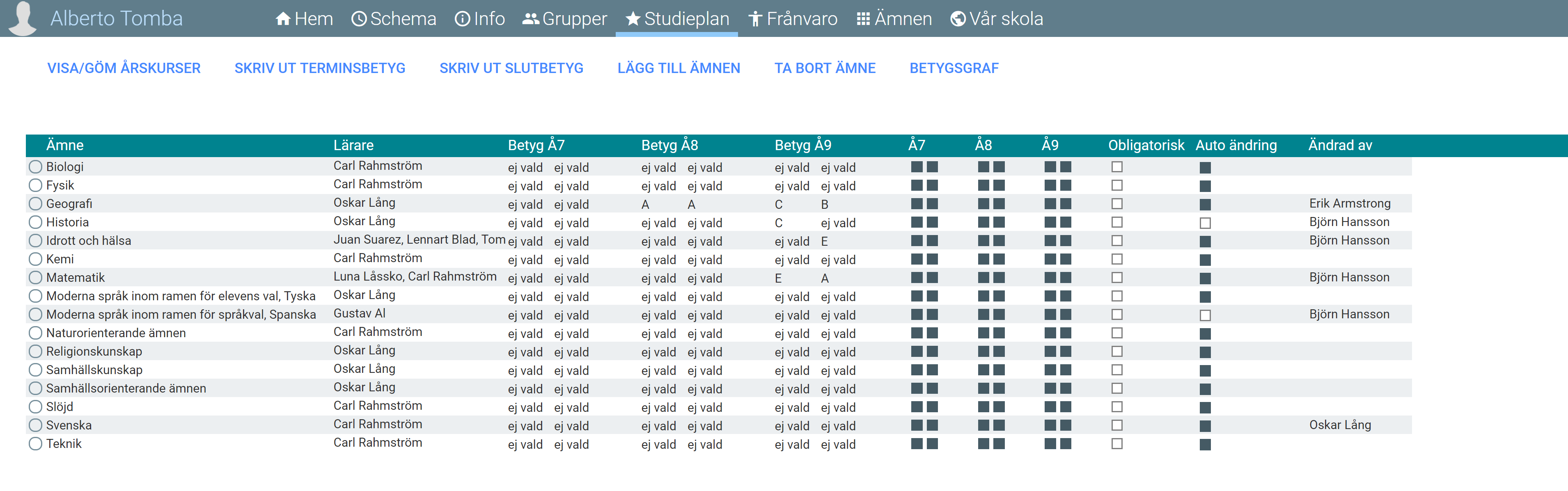 Fliken "Studieplan" visar elevens individuella studieplan. Här kan man välja valbara ämnen, skriva ut studieplan och betygsdokument, sortera ämnen i olika kategorier och fylla i noteringar. Studieplanen kan se olika ut beroende på skolform. Den här sidan dokumenterar elevers studieplaner i grundskolan. Se annars sidorna för